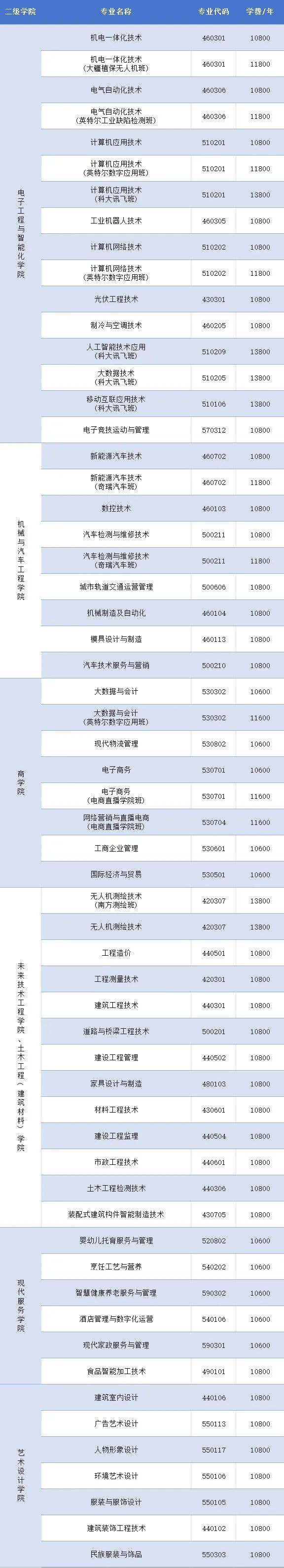 学校招生专业表如下