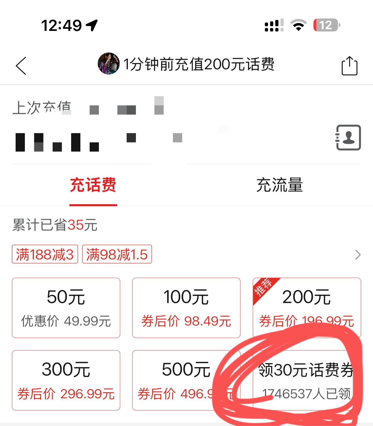 然后进入,选择右下角领30元话费券